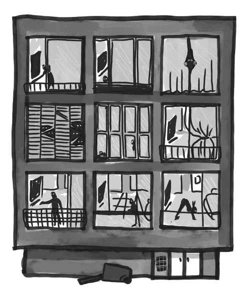 וזו לא רק אני. כולם עומדים בחלון לבושים חליפות בית שלושה חלקים. כשאני משקיפה ממנו כדי לראות מה העניינים, אני רואה עוד עשרה פרצופים לפחות שבודקים מה מתרחש. בעיניהם המבט הזה, שמערבב בין החשש שרק אתה הפראייר שתקוע בבית בזמן שכולם מסתובבים ונהנים, לבין הצורך העז באקשן שיספקו אנשים שאין לך מושג איך קוראים להם.