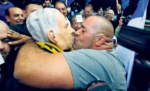 איש גדול וחזק מעניק נשיקה לוהטת לגבר מבוגר ממנו. עיניו עצומות, שפתיו משורבבות, זרועו השמאלית מחבקת בכוח את צווארו של מושא הנשיקה, זרועו הימנית מרחיקה גבר אחר שמבקש להתקרב. מסביב ההמון מריע. לרגע קצרצר זה עשוי להיראות כמו חגיגת ניצחון בבג"ץ הפונדקאות השבוע. אבל החגיגה היא של ניצחון אחר לגמרי.